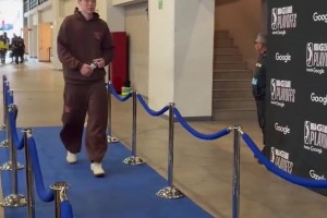 西海岸风格?球迷场边实拍配文:SGA入场 这裤子都要掉了