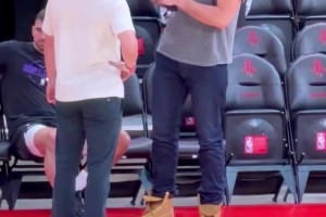 不知恢复得如何了?亚当斯在场边和大家聊天~
