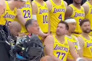 没想到都报销了此前湖人大合照,东契奇里夫斯哥俩打打闹闹