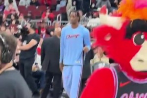 狄龙赛前和公牛吉祥物互送注目礼,有点名场面的意思了