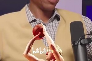 亚历山大从女主持人手中接过年度最佳关键球员奖杯,队友在旁起哄