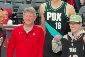 很开心啊~杨瀚森赛后赠送签名球衣给小球迷&还合影留念!