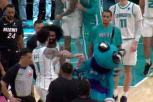 三球激情庆祝!黄蜂吉祥物跑过来挨了他一顿毒打