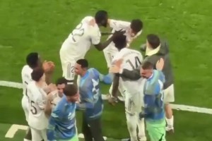 替补席所有人都在庆祝居勒尔进球,阿韦洛亚也送上拥抱!