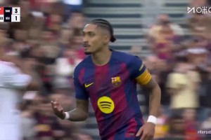 帽子戏法!拉菲尼亚接费尔明直塞起脚抽射,皮球折射进死角
