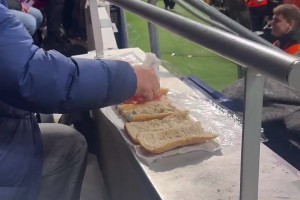 实拍:这位马竞球迷在对阵巴萨比赛时,在场边精心准备三明治