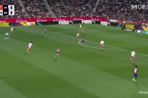 拉菲尼亚倒三角传中,亚马尔迎球兜射稍稍偏出