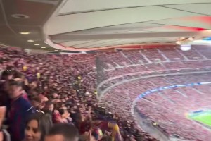 实拍:巴萨打进两球扳平总比分后,看台的巴萨球迷在集体跳舞